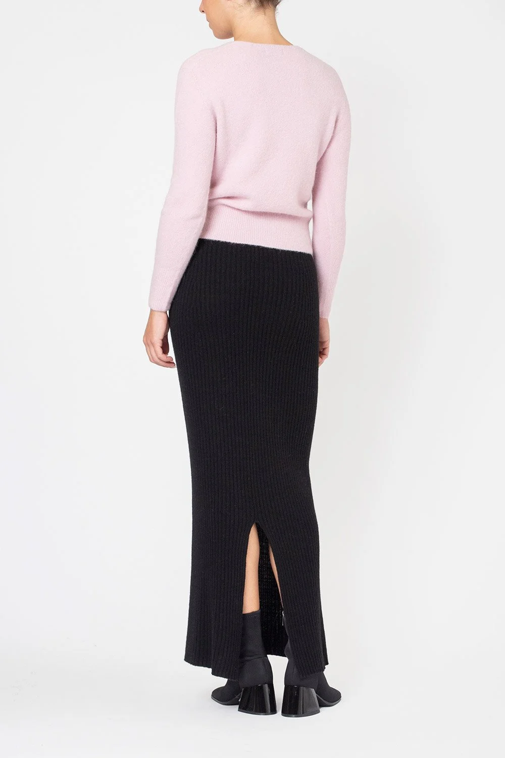 A-line midi skirt with self-fabric waistband. Invisible zip on back. No lining inside. Tight fitting.